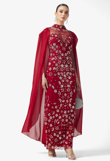 Stunning cape sleeve maxi dress with elegant embellishments for a sophisticated and graceful look.