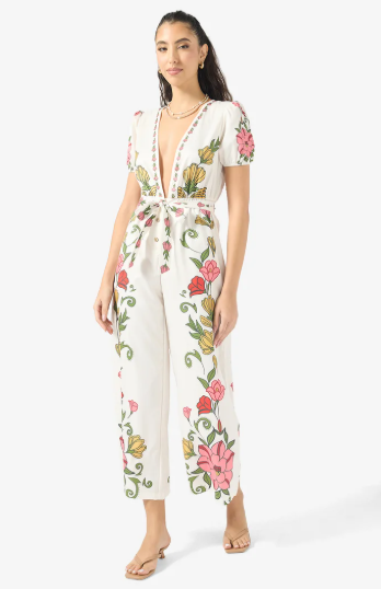 Floral print plunge neck jumpsuit, perfect for a chic and feminine look.