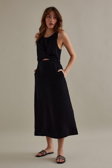 A timeless black linen midi dress crafted from breathable, natural fabric ā designed with a flattering silhouette and versatile style perfect for casual days or elevated summer evenings.
