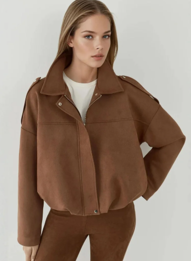 Soft textured suede bomber jacket, perfect for a stylish and casual outerwear look.