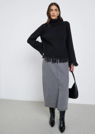 Styli black sweater with fringe hem, combining cozy comfort with a trendy, stylish look.