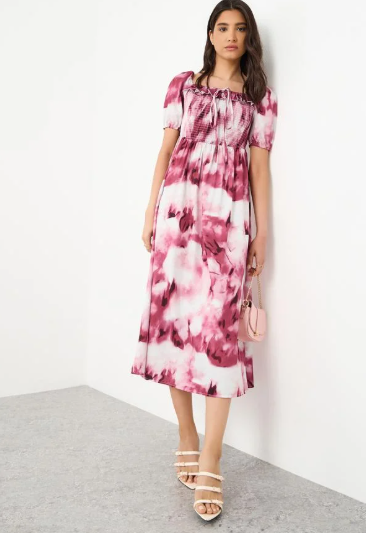 Stylish all-over printed midi dress with smocking detail for a flattering and feminine look.